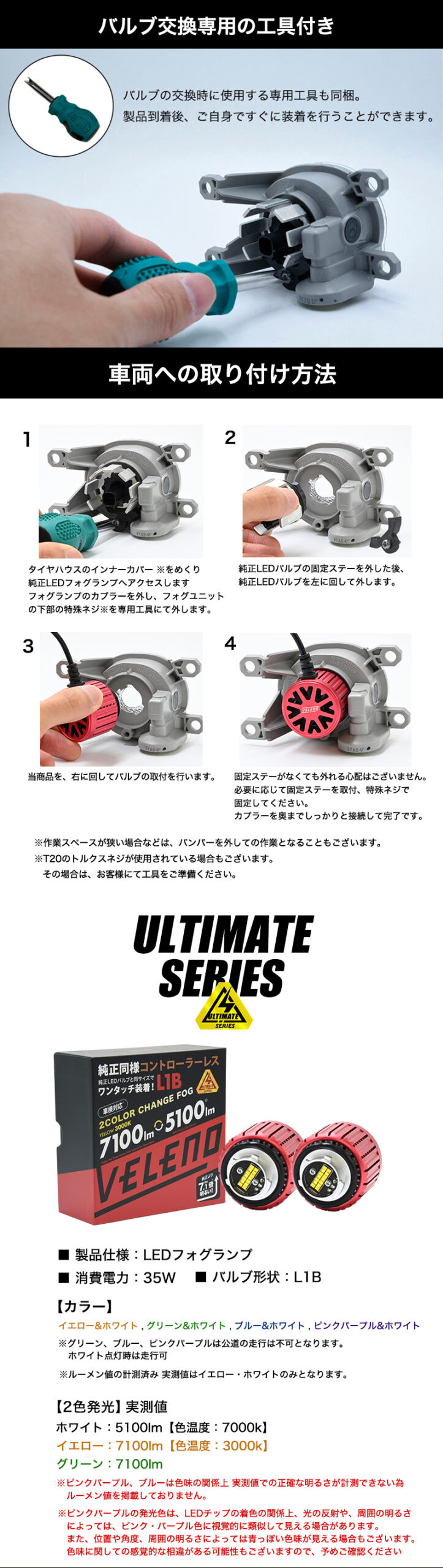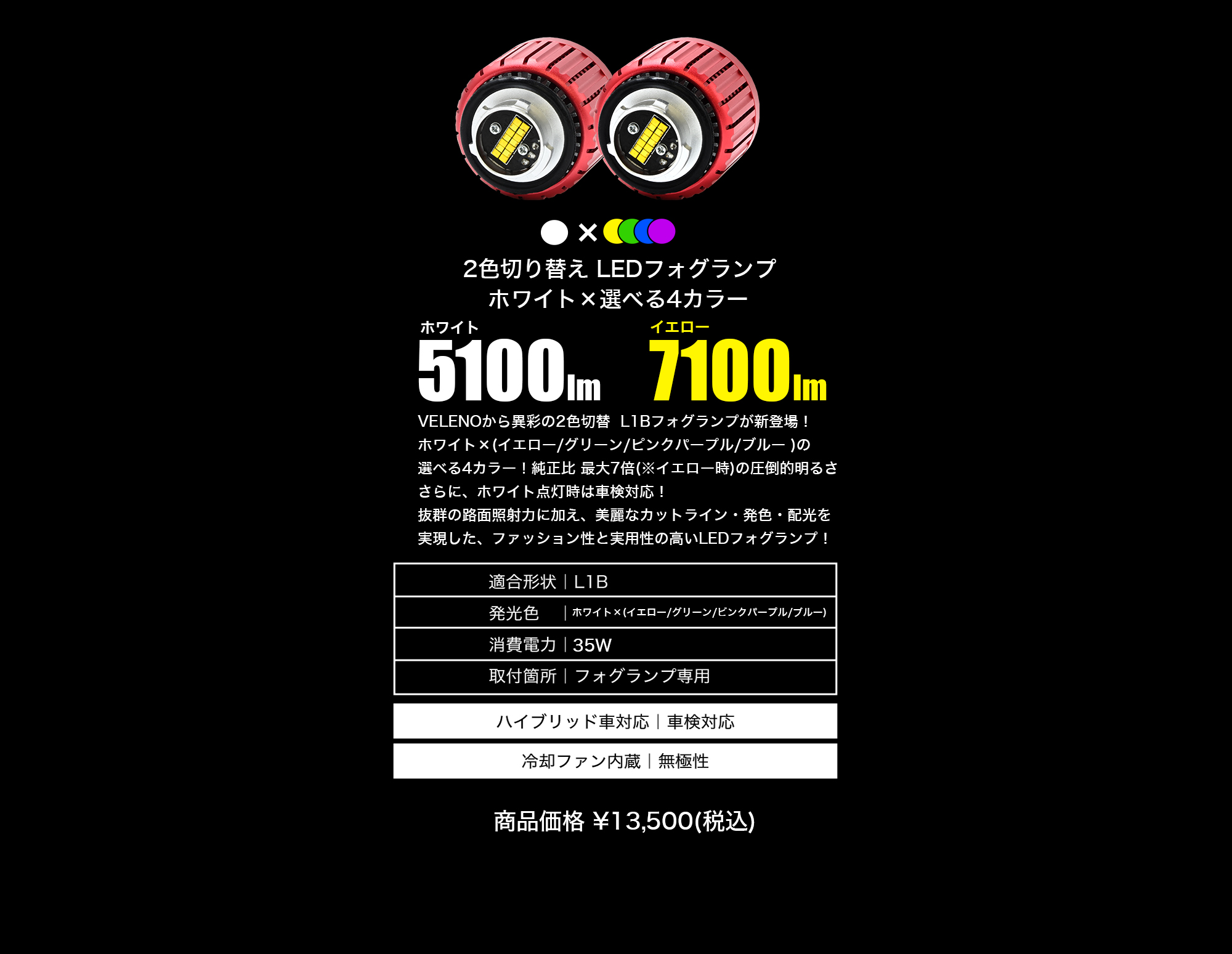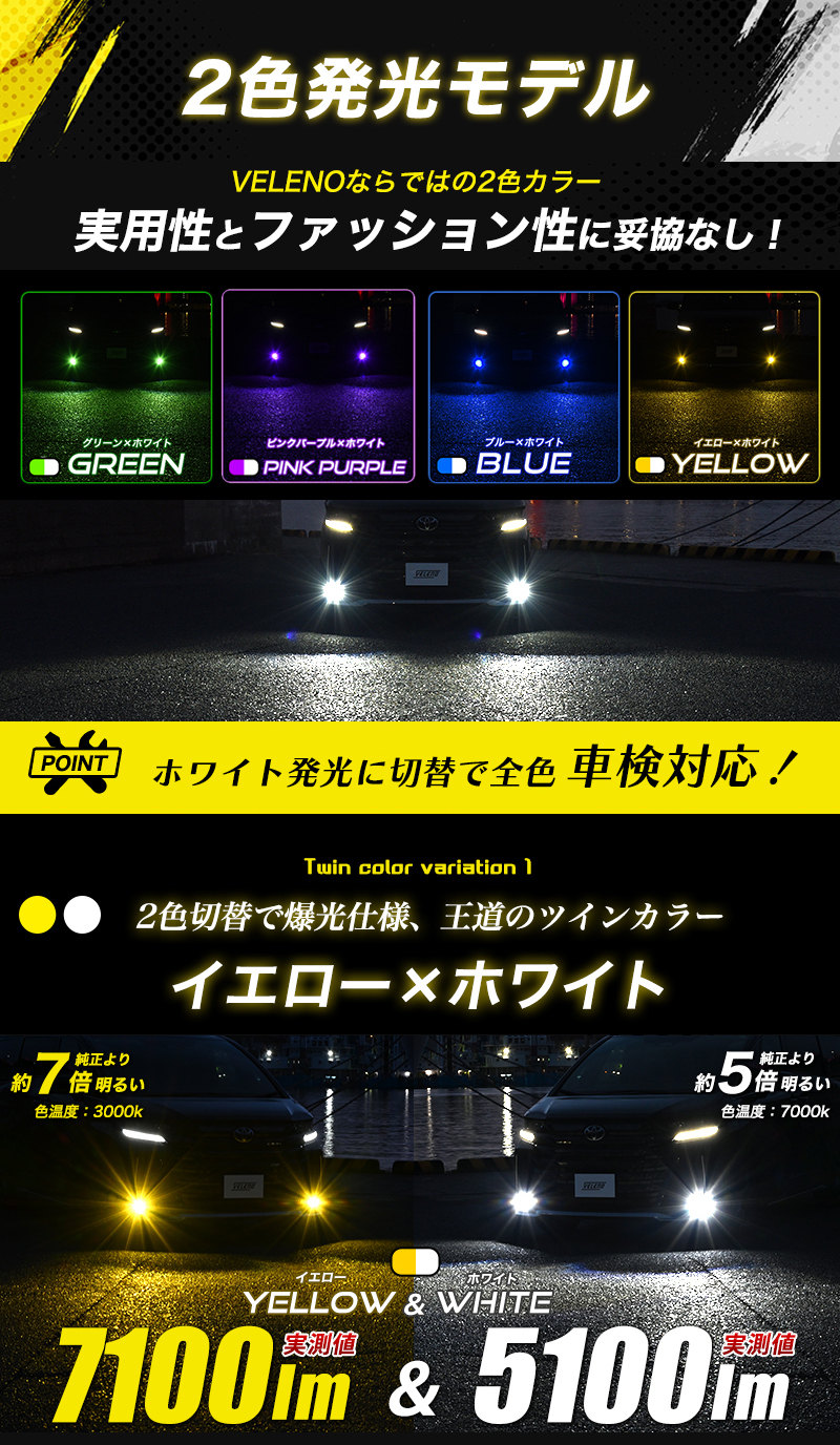 VELENO 2色切り替え LEDフォグランプ 5100lm ホワイト × 7100lm イエロー / グリーン / ブルー /ピンクパープル【L1B】
