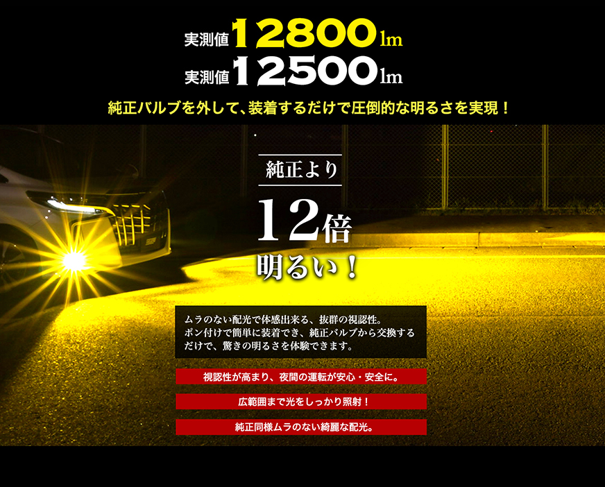 【光量 (実測値)】12800lm (イエロー) , 12500lm (ホワイト)